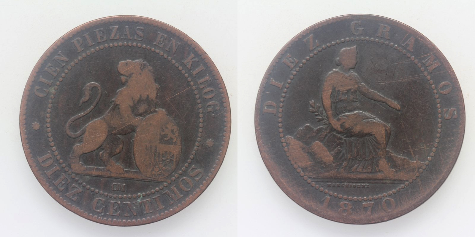 Spanien 10 Centimos/10 Gramo 1870