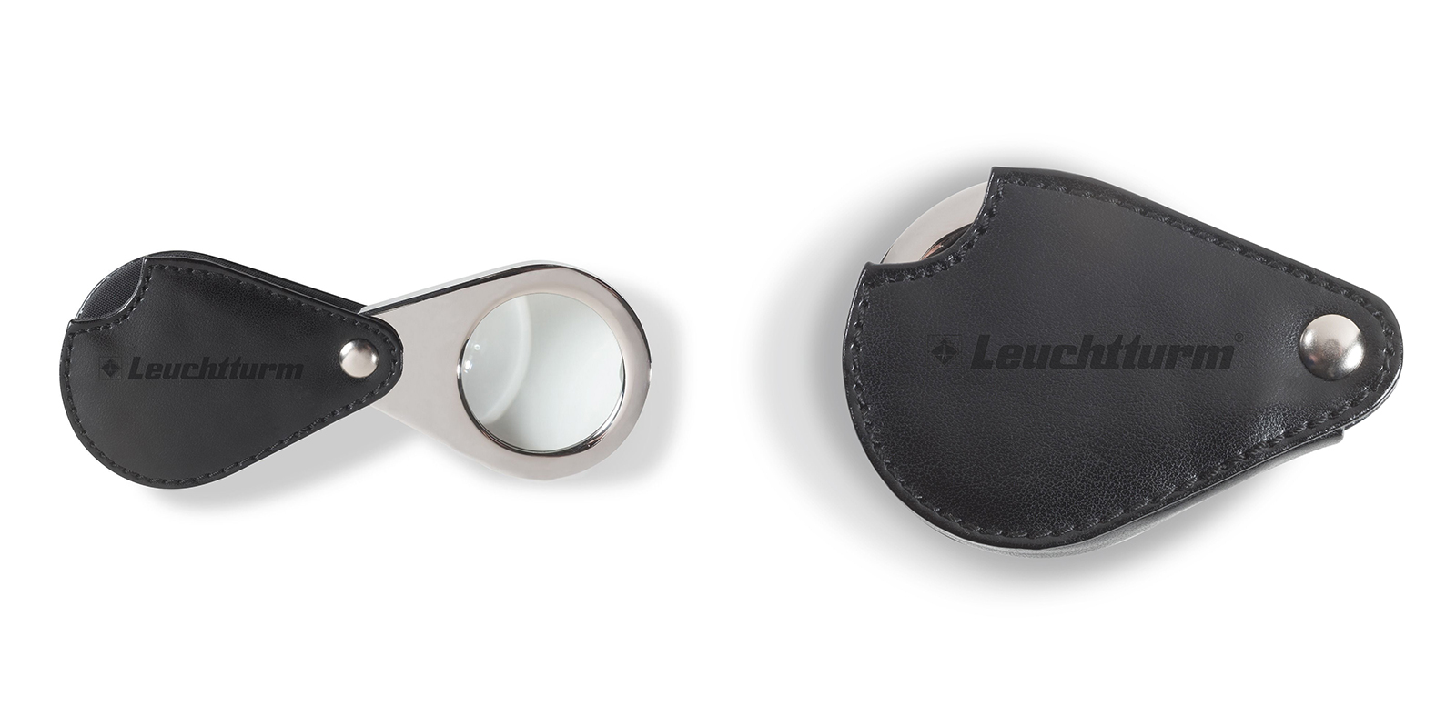 Taschen-Einschlaglupe mit 3-facher Vergrößerung.Hochwertige, asphärische Acryllinse, Linsenfassung aus Metall (verchromt), Einschlag aus echtem Leder (schwarz) - Bildquelle www.leuchtturm.de