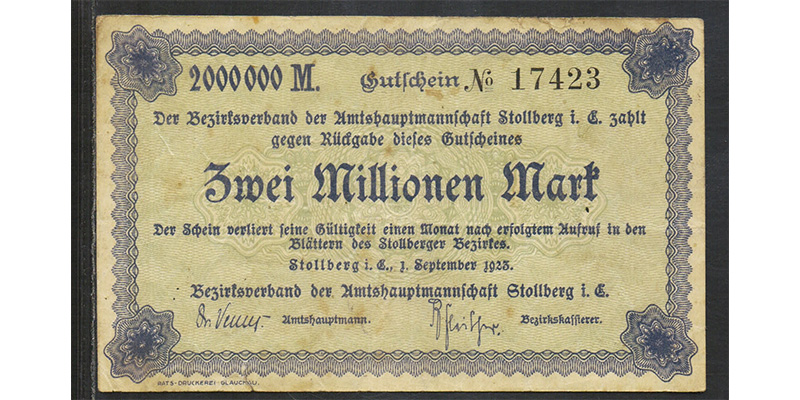 Sachsen 2 Millionen Mark 1923 Stollberg / Erzgebirge