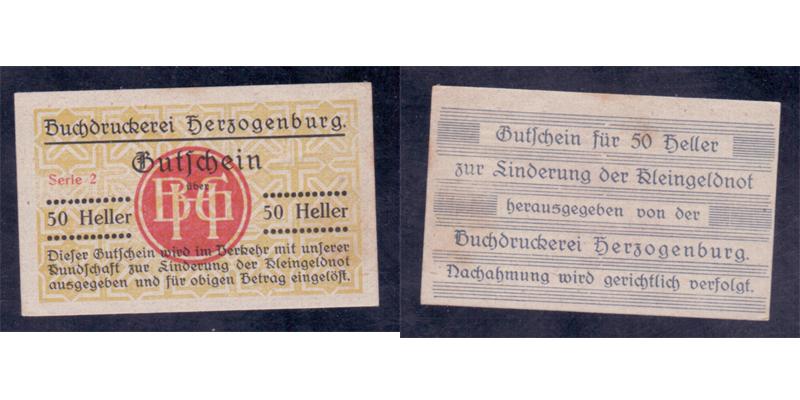 NÖ Gutschein 50 Heller Buchdruckerei Herzogenburg
